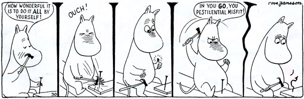 The Moomin house is built out of no prefabricated parts. As an inspiration I used the ideas at Skogsindustrierna (Forest industies in Sweden).